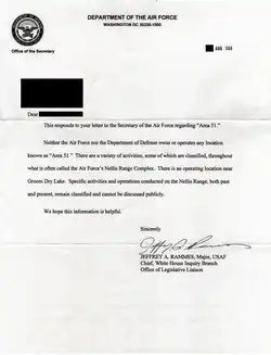 - ↑ Leiby, Richard. «Government officially acknowledges existence of Area 51, but not the UFOs». The Washington Post (em inglês). Consultado em 16 de julho de 2019. Cópia arquivada em 7 de agosto de 2017