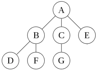 Representação simples de uma árvore. O nodo A, a raiz, tem como filhos diretos: B, C, E e filhos indiretos: D, F e G. B, C e E são irmãos, assim como D e F.