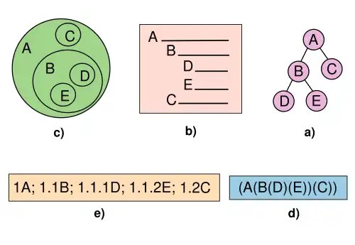 Diferentes representações de uma árvore: a) hierárquica, b) diagrama de barras, c) diagrama de inclusão, d) aninhamento e e) numeração por níveis
