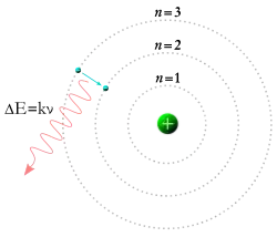 Para um eletrão poder transitar entre dois estados diferentes, deve absorver ou emitir um fotão cuja energia corresponda à diferença entre os potenciais de energia desses níveis. A energia de um fotão emitido é proporcional à sua frequência, fazendo com que estes níveis de energia específicos apareçam como bandas distintas no espectro eletromagnético.[52] Cada elemento tem um espectro característico que pode variar em função da carga nuclear, de subcamadas preenchidas por eletrões e de interações eletromagnéticas entre os eletrões e outros fatores.[53]