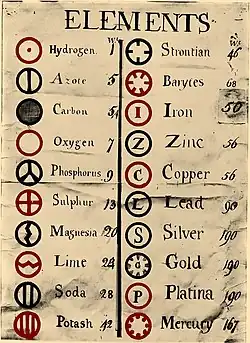 Ao longo do século XVIII, foram descobertos diversos elementos químicos, tais como a platina (1735),[121] o níquel (1751),[122] o magnésio (1755)[123] e o oxigénio (1771).[124][125] Porém, ainda não havia sido formulada uma teoria que explicasse uma relação inequívoca entre os átomos e os elementos químicos. Com a sistematização da Lei das proporções definidas por Joseph Louis Proust e a lei da conservação da massa por Antoine Lavoisier, foi consolidado o conhecimento que permitiu ao inglês John Dalton explicar em 1803, a partir do conceito de átomo, o motivo pelo qual os elementos reagem sempre numa pequena razão de números inteiros e o porquê de certos gases se dissolverem melhor na água do que outros. Dalton propôs que cada elemento fosse constituído por átomos de um único tipo e que grupos de átomos diferentes formariam os compostos químicos. Isto possibilitou o cálculo da massa atómica relativa dos átomos e a identificação de uma relação inequívoca entre um dado átomo e o respectivo elemento químico.[126][127] Por esse feito, Dalton é considerado o pioneiro da teoria atómica moderna.[128]