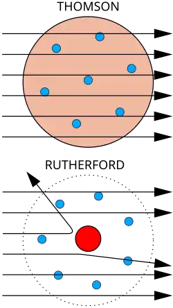 No entanto, em 1909, um grupo de investigadores sob a orientação do físico Ernest Rutherford bombardeou uma folha de ouro com iões de hélio e descobriu que uma pequena percentagem era defletida com ângulos muito maiores do que aqueles que eram previsíveis segundo o modelo de Thomson. Rutherford interpretou a experiência da folha de ouro como uma sugestão de que a carga positiva de um átomo e a maioria da sua massa estavam concentradas num núcleo no centro do átomo, enquanto os eletrões orbitavam à sua volta de forma semelhante aos planetas à volta do sol — o modelo atómico de Rutherford. Os iões de hélio com carga positiva perto deste núcleo denso seriam então defletidos em ângulos muito maiores.[137]