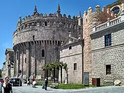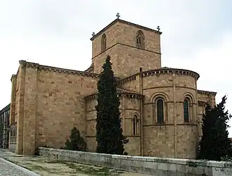 Basílica de São Vicente: sua construção teve início no século XII, no estilo românico e foi finalizada no século XIV.[45] A fase final dessa construção foi atribuída ao mestre francês, Giral Fruchel, introdutor do estilo gótico na Espanha e que participou também da construção da catedral. A estrutura geral é similar à das basílicas latinas.[45]Parte traseira da Basílica de São Vicente de Ávila