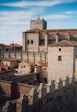 Catedral de El Salvador de Ávila: a sua construção decorre entre os séculos XII e XV. Gozava de uma função militar e defensiva graças à sua cabeceira fortificada,[39] cuja torre está montada na mesma muralha da cidade.[40] Inicialmente foi construída em estilo românico, pelo Mestre Fruchel.[39]No início do século XIII, o estilo gótico foi adotado nas obras.[39]O mestre Fruchel iniciou as obras inspirando-se na Basílica de Saint-Denis.[40] Durante o primeiro terço do século XIV, o bispo Sancho Blázquez Dávila reativou as obras da catedral.[39]É uma das edificações que deu início à introdução do gótico francês na península e é considerada a primeira catedral gótica da Espanha,[41][42] é construída principalmente em granito.[43] Na catedral, destaca-se o monumental retábulo-mor, iniciado por Pedro Berruguete em 1499 até sua morte e que contaria também com a participação de Juan de Borgonha.[44]