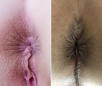 Ânus humanos, feminino (à esquerda) e masculino (à direita), ambos exibindo a rafe perineal