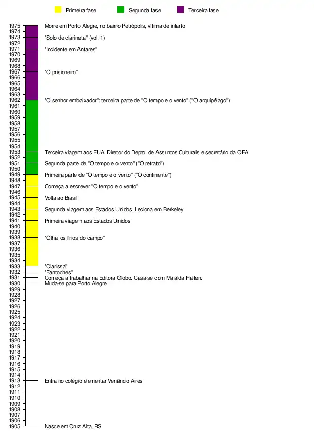 É possível distinguir três fases da obra do autor. A primeira engloba todos os romances anteriores a O Tempo e o Vento — Clarissa, Caminhos Cruzados, Música ao Longe, Um Lugar ao Sol, Saga e O Resto É Silêncio. Essa fase é caracterizada pelo registro da vida urbana da capital do estado em que o escritor nasceu, sendo por essa razão chamada de "ciclo de Porto Alegre".[15] Nessas obras, é muito usada a estratégia do corte transversal na sociedade; isto é, uma fatia da vida é isolada e apresentada na obra literária.[16] Todos os romances dessa fase estão ambientados nessa cidade (que na época contava 300 mil habitantes), explícita ou de modo subentendido, pois era onde o autor residia nessa fase de sua vida.[9]