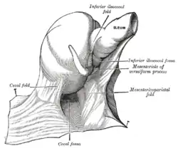 ![]() A fossa cecal. O íleo e ceco são atraídos para trás e para cima. | |