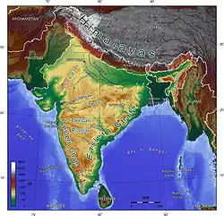 A placa original indiana corresponde hoje ao subcontinente indiano, sendo também a parte mais antiga e estável da Índia, que se estende desde o norte, com as cordilheiras Satpura e Vindhya no centro. Estas cordilheiras paralelas vão desde a costa do mar Arábico, no estado de Gujarat, até o planalto de Chota Nagpur, no estado de Jarcanda.[122] No sul, o planalto do Decão contém à esquerda e à direita os Gates Ocidentais e Orientais;[123] o planalto contém as formações rochosas mais antigas do território, algumas com mais de um bilhão de anos de idade. Os pontos extremos do país se localizam a 6° 43' e 39° 26 'de latitude norte[c] e 68°7' e 89°25' de longitude leste.[124]