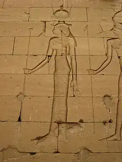 Ísis com os chifres de vaca e glifo de trono. Templo de Calabexa, c. século I a.C. ou I d.C.