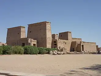 O cristianismo tornou-se, durante os séculos IV e V d.C., a religião predominante no Império Romano, incluindo o Egito. Os cultos em templos egípcios morreram gradualmente e em diferentes épocas devido uma combinação de falta de dinheiro e hostilidade dos cristãos.[112] O templo de Ísis em Filas, graças aos seus adoradores núbios, conseguiu manter um sacerdócio organizado e festivais regulares até pelo menos a metade do século V, fazendo dele o último templo em funcionamento do Egito.[113][nota 3]