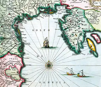 - ↑ O autor, Blaeu, não assinala no mapa o condado habsbúrgico de Pazin (Pisino), pois o seu atlas baseia-se na obra de 1750 Theatrum Orbis Terrarum de Abraham Ortelius que relata dados políticos anteriores a 1536 (quando Pazin era veneziana há um século).