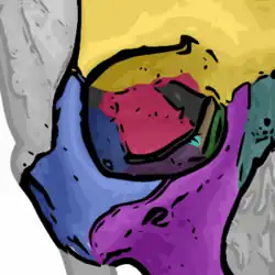![]() amarelo = Osso frontal verde = Osso lacrimal marrom = Osso etmóide azul = Osso zigomático roxo = Osso maxilar aqua = Osso palatino vermelho = Osso esfenóide teal = Osso nasal O osso nasal é ilustrado mas não faz parte da composição da órbita. | |