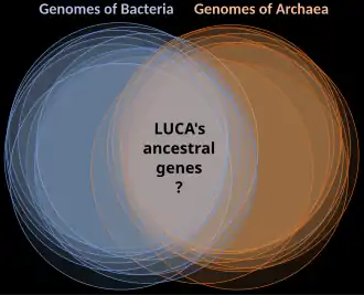 Uma versão modificada da árvore, baseada em vários estudos moleculares, tem a sua raiz entre um monofilético domínio Bactéria e um clado formado por Archaea e Eukaryota.[50] Uma pequena minoria de estudos coloca a raiz no domínio bactéria, no filo Bacillota,[52] ou afirma que o filo Chloroflexota (anteriormente Chloroflexi) é basal a um clado com Archaea e Eukaryotes e o resto das bactérias (como proposto por Thomas Cavalier-Smith).[53] Análises metagenómicas recuperam um sistema de dois domínios com os domínios Archaea e Bacteria; nesta visão da árvore da vida, Eukaryotes são derivados de Archaea.[54][55][56] Com o posterior conjunto genético dos descendentes do LUCA, partilhando uma estrutura comum da regra AT/GC e os vinte aminoácidos padrão, a transferência horizontal de genes teria-se tornado viável e poderia ter sido comum.[57]