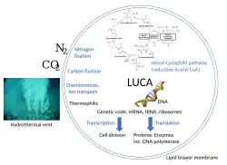 Em 2016, Madeline C. Weiss e colegas analisaram geneticamente 6,1 milhões de genes codificadores de proteínas e 286 514 clusters de proteínas de genomas procarióticos sequenciados representando muitas árvores filogenéticas, e identificaram 355 clusters de proteínas que provavelmente eram comuns ao LUCA. Os resultados da sua análise são altamente específicos, embora debatidos. Eles retratam o LUCA como "anaeróbico, CO2-fixador, H2-dependente com uma via de Wood-Ljungdahl (a via redutiva do acetil-coenzima A), N2-fixador e termófilo. A bioquímica do LUCA estava repleta de clusters FeS e mecanismos de reação radical."[22] Os cofatores também revelam "dependência de metais de transição, flavinas, S-adenosil metionina, coenzima A, ferredoxina, molibdopterina, corrinas e selénio. O seu código genético exigia modificações de nucleósido e metilaçãos dependentes de S-adenosilmetionina".[22] Eles mostram que metanogénios e clostrídios eram basais, perto da raiz da árvore filogenética, nas 355 linhagens de proteínas examinadas, e que o LUCA pode, portanto, ter habitado um ambiente de fonte hidrotermal anaeróbica num ambiente geoquimicamente ativo rico em H2, CO2 e ferro, onde a água do oceano interagia com magma quente sob o leito oceânico.[22] É até inferido que o LUCA também cresceu a partir de H2 e CO2 via o ciclo de Krebs inverso incompleto.[23] Outras vias metabólicas inferidas no LUCA são a via das pentoses fosfato, a glicólise e a gliconeogénese.[24] Mesmo que evidências filogenéticas possam apontar para um ambiente de fonte hidrotermal para um LUCA termófilo, isto não constitui evidência de que a origem da vida ocorreu numa fonte hidrotermal, uma vez que extinções em massa podem ter removido ramos de vida previamente existentes.[25]