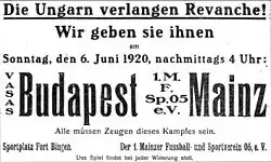 Ingresso para o jogo entre o Mainz 05 e o Vasas Budapest