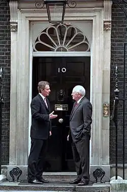 | Logo após assumir o cargo em 1997, Tony Blair concordou em trocar de moradia com seu Chanceler, Gordon Brown, uma vez que o apartamento do Número 11 era maior e melhor atendia às necessidades da família Blair. Brown permaneceu no Número 10 após suceder Blair como primeiro-ministro em 2007.[78] | ||||