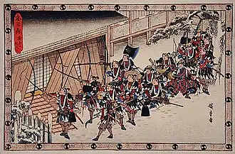 Após posicionar os arqueiros (alguns no telhado), para evitar que aqueles que estavam em casa (que ainda não tinham despertado) fossem ao envio de ajuda, Ōishi soa o tambor para começar o ataque. Dez dos soldados de Kira foram para a frente da casa, mas o grupo de Ōishi Chikara invadia pela parte de trás da casa.[26]