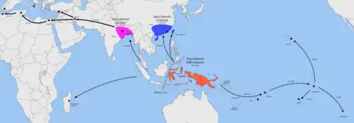 Mapa mostrando centros de origem de Saccharum officinarum na Nova Guiné, Saccharum sinensis no sul da China e Taiwan, e Saccharum barberi na Índia; setas pontilhadas representam introduções austronésicas[33]
