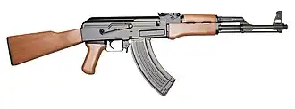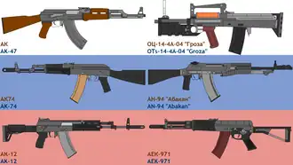 O fuzil de assalto AK-47 (Avtomat Kalashnikova - 47, fuzil automático Kalashnikov, modelo de 1947) surgiu na União Soviética logo após o fim da Segunda Guerra Mundial inspirado no fuzil de assalto alemão Sturmgewehr 44, sendo o fuzil mais fabricado de todos os tempos.[7] Estima-se que o número de exemplares produzidos tanto na Rússia como sob licença em países como a Bulgária, China, Hungria, Índia, Coreia do Norte, Romênia entre outros, chegue a impressionante cifra de 90 milhões. Países como a Finlândia e Israel também se basearam no projeto deste fuzil para produzirem seus modelos M62 e Galil, respectivamente. É caracterizado por sua grande rusticidade, facilidade de produção em massa, simplicidade de operação e manutenção, além de reconhecida estabilidade em baixas e altas temperaturas. Deixa a desejar nos requisitos precisão, ergonomia e peso.