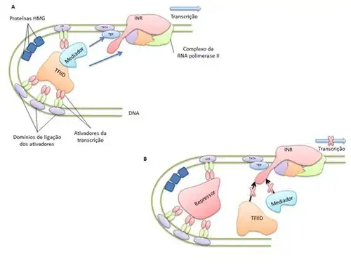 Algumas moléculas conhecidas como repressoras podem interagir com o mediador ou com os domínios de ativação e impedir a ligação desses aos fatores de transcrição, diminuindo ou parando totalmente a transcrição daquele gene[34] (figura 7B).