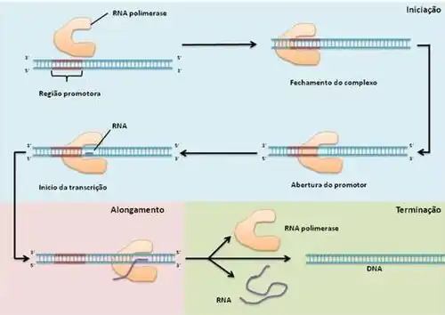 Os promotores de procariontes apresentam duas sequências hexonucleotídicas que se localizam a 35 e 10 pares de base da extremidade 5’ do sítio em que se inicia a transcrição, definido como +1. Logo, essas sequências também são conhecidas como -35 e -10, respectivamente. Essas regiões são reconhecidas pelos fatores σ, os quais determinam os genes a serem transcritos por meio da seletividade à sequência do DNA. Ao contrário dos genes housekeeping, que são regulados pelo mesmo fator σ, as regiões promotoras de genes que são transcritos em resposta a estímulos internos ou externos são regulados por fatores σ específicos, de maneira que a transcrição desses depende primariamente da síntese e quantidade dos seus respectivos fatores σ.[15] Portanto ao se associarem às RNA polimerases, os fatores σ determinam os genes a serem transcritos, desempenhando um papel crucial na regulação desse processo.[16] O complexo proteico formado pela RNA pol e o fator σ é chamado de holoenzima RNA polimerase. Quando esta se liga ao DNA, denomina-se complexo promotor fechado. Após a desespiralização e abertura do DNA, forma-se o complexo promotor aberto, ou bolha de transcrição, e ocorre o pareamento dos ribonucleotídeos com a fita molde. Ao iniciar a síntese de RNA, a RNA polimerase armazena energia para quebrar a interação com a região promotora pelo fator σ. Enquanto isso não acontece, oligômeros de RNA são descartados,[17] processo chamado iniciação abortiva. Quando o polímero que está sendo sintetizado atinge aproximadamente 10 pares de bases, o fator σ se dissocia da RNA polimerase, a qual deixa de interagir com o promotor e continua a transcrição ao longo da molécula de DNA até identificar um sinal de parada, ou terminador. Este pode ser Rho dependente ou independente. No primeiro caso, Rho se liga na extremidade livre do RNA que está sendo sintetizado e a partir da hidrólise de ATP, essa proteína consegue se deslocar pelo RNA e promover a dissociação da RNA polimerase do DNA, liberando, assim, a fita de RNA.[18] O término independente de Rho acontece devido à transcrição de sequências invertidas geralmente ricas em citosina e guanina, que por serem complementares, se pareiam formando uma estrutura de grampo. Essas sequências são sucedidas por timina e adenina, que conferem uma ligação mais fraca entre o RNA e o DNA. Desta forma, quando o grampo formado empurra a molécula de RNA contra o DNA, a RNA pol se dissocia do complexo DNA-RNA-pol-RNA.[14]