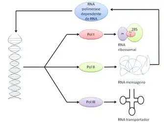 - RNA polimerase dependente de RNA: atua na replicação do genoma de vírus de RNA e na amplificação de RNA de interferência em eucariontes, atuando de forma semelhante a RNA polimerase DNA dependente.