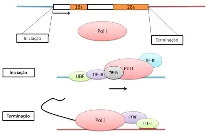 A RNA polimerase I atua em regiões promotoras específicas denominadas 18, 28 e 5,8s, atuando na transcrição dos genes ribossomais. Dessa forma, a atividade dessa enzima interfere na produção do ribossomo, interferindo indiretamente na tradução celular, ao inibir a síntese de RNA ribossomal a célula pode entrar em processo de morte celular por apoptose ou autofagia, ou em processo de senescencia.[21] O processo de transcrição é modulado por fatores que atuam no reconhecimento de regiões específicas, alongamento e término da transcrição. A iniciação ocorre quando a proteína UBF (upstream binding factor) interage com pequenas porções específicas do DNA, tornando possível a interação com a proteína TIF-IB (promoter selectivity factor), formando um complexo. A UBF inibe ainda a interação de histonas com a fita de DNA, o que impossibilitaria a ação da RNA polimerase I por impedimento espacial. O complexo formado por UBF e TIF-IB possui sítios que são reconhecidos pela proteína TIF-IA, gerando um novo complexo, que irá apresentar sítios para o reconhecimento do DNA pela RNA polimerase I. A transcrição persiste até o reconhecimento de sinais específicos de término, entre eles o TTF-1 (transcription termination factor),o qual inibe a ação enzimática da RNA polimerase I, e o PTRF (polymerase and transcript release factor), que determina a liberação do RNA recém-transcrito da maquinaria de transcrição.[22][23][24] (Figura 4). Alterações na atividade da polimerase I ou dos fatores que interferem na sua atividade estão associadas com diversas patologias denominadas ribosomospatias.[24][25][26]