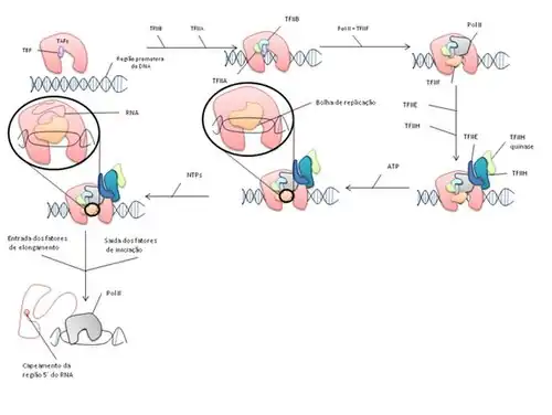 A RNA polimerase II é uma enzima com 12 subunidades que transcreve genes que codificam RNA mensageiro, tendo grande impacto na diferenciação e manutenção celular. Já foram descritas modulações em diversos estágios da transcrição, sendo que tal ação é um mecanismo central no controle da expressão gênica.[19][27] Para o início da sua ação, a RNA polimerase II conta com a ação de fatores de transcrição como o TF-IIB, o TF-IID, o TF-IIF e o TF-IIH que geram, em regiões específicas do DNA, complexos de pré-iniciação. Tais complexos auxiliam a ligação da RNA polimease II às regiões do DNA que serão transcritas, assim como estimulam a saída da RNA polimerase II da região promotora. A subunidade TAF do TF-IID, pode estar ligada à proteína TBP (TATA Box-bindingProtein), formando um complexo que irá interagir com sequências TATA presentes no DNA, sinalizando os genes que serão transcritos pela RNApol II. No modelo clássico, ilustrado na figura 5, o complexo formado por RNA pol II e o TF-IIF interage com o complexo TF-IIB e TBP juntamente com a região promotora do DNA, resultando no complexo de iniciação da transcrição. Tal complexo se liga ao TF-IIE e ao TF-IIH, formando o denominado complexo de pré-iniciação (PIC) que contém no seu sitio ativo DNA de dupla fita, que será trancrito. Na presença de nucleotídeos, uma porção central do DNA sofre separação das fitas, gerando uma bolha de transcrição.[28] Nessa bolha, uma das fitas do DNA atua como molde e passa próximo ao sítio ativo da RNA pol II. Desta forma, a RNA pol II consegue exercer sua ação enzimática em cadeia, formando o RNA mensageiro.[19][29]