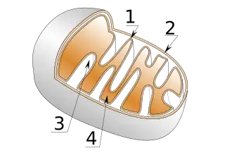 Estrutura mitocondrial: (1) membrana interna, (2) membrana externa, (3) cristas, (4) matriz