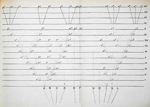 Darwin propõe a seleção sexual, impulsionada pela competição entre machos por parceiros, para explicar características sexualmente dimórficas, como crinas de leão, chifres de veado, caudas de pavão, canto de pássaros e a plumagem brilhante de alguns pássaros machos.[127] Ele analisou a seleção sexual mais completamente em A Descendência do Homem e Seleção em Relação ao Sexo (1871). Esperava-se que a seleção natural trabalhasse muito lentamente na formação de novas espécies, mas dada a eficácia da seleção artificial, ele podia "ver nenhum limite para a quantidade de mudança, para a beleza e complexidade infinita das coadaptações entre todos os seres orgânicos, um com o outro e com suas condições físicas de vida, que podem ser efetuadas com o decorrer do tempo pelo poder de seleção da natureza”. Usando um diagrama de árvore e cálculos, ele indica a "divergência de caráter" das espécies originais em novas espécies e gêneros. Ele descreve os ramos caindo quando a extinção ocorreu, enquanto novos ramos se formaram na "grande árvore da vida ... com suas ramificações sempre ramificadas e lindas".[128]
