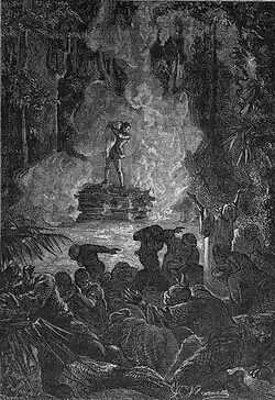 Já em Bombaim, os dois pegam um trem para Calcutá, na costa leste indiana. Surge um imprevisto, porém: a ferrovia estava inacabada. Tiveram, então, que descer na metade do caminho e improvisar um segundo meio de transporte até chegar ao outro ponto da rede, onde haveria outro trem. Fogg, um homem mais que remediado, compra para si um elefante, e seguem viagem. Um guia é contratado para levá-los selva adentro até alcançarem a outra parte da ferrovia. No caminho, presenciam um estranho ritual nativo que lhes dá calafrios: uma bela mulher era carregada para ser queimada viva junto ao corpo do marido, já morto. Tinham o costume de que, se o marido morresse, a mulher deveria morrer junto. Fogg, incrédulo, não podia acreditar em tal façanha. Como estava algumas horas adiantado no seu intento, decide dar meia volta e resgatar a moça. Passepartout finge que é o cadáver e entra no caixão. Na hora do ritual, levanta de seu leito fúnebre e carrega a donzela nos braços, provocando arrepios nos que assistiam à cerimônia. Assim, eles resgatam a moça, Aouda, e conseguem fugir.