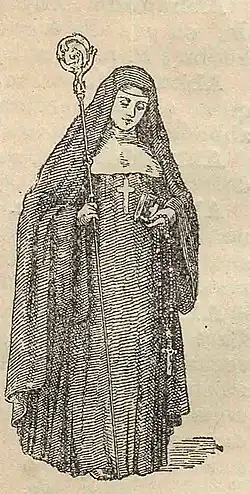 Abadessa | As Abadessas usam o brasão em elipse envolvido pelo terço e ornado pelo báculo abacial (com velo no nó). |