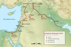 A Bíblia diz que Abraão, obedecendo as ordens de Deus, saiu com Ló de Harã, juntamente com sua esposa e seus bens, indo em direção a Canaã.[16] O texto informa que Abraão já teria setenta e cinco anos de idade e dá a entender que já tivesse pessoas a seu serviço, embora nenhum filho.