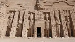 A própria porta de entrada é encimada por imagens em baixo-relevo do rei adorando o Rá-Horakhty com cabeça de falcão, cuja estátua fica em um grande nicho.[9] Rá segura um hieróglifo e uma pena em sua mão direita, com Maat (a deusa da verdade e da justiça) em sua esquerda; este é um criptograma para o nome do trono de Ramesses II.