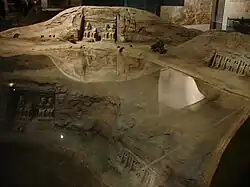 Um modelo em escala que mostra a localização original e atual do templo (em relação ao nível da água) no Museu Núbio, em Assuã