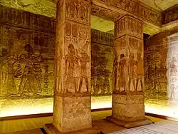 Do salão hipostilo entra-se no segundo salão com pilares, que possui quatro pilares decorados com belas cenas de oferendas aos deuses. Existem representações de Ramessés e Nefertari com os barcos sagrados de Amom e Rá-Horaqueti. Este salão dá acesso a um vestíbulo transversal, no meio do qual se encontra a entrada do santuário. Aqui, em uma parede preta, estão esculturas talhadas na rocha de quatro figuras sentadas: Rá-Horaqueti, o rei deificado Ramessés e os deuses Ámon Rá e Ptá, as principais divindades naquele período e seus centros de culto estavam em Heliópolis, Tebas e Mênfis, respectivamente.[9]