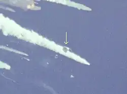 ![]() Nuvem de fumaça após a desintegração da Challenger. Seus propulsores de combustível sólido voam incontrolavelmente enquanto os destroços do orbitador e tanque de combustível externo deixam rastros à medida que caem em direção ao mar. | |