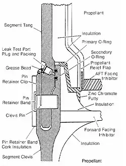 Os dois propulsores de combustível sólido, construídos na época pela Morton Thiokol,[14] proporcionavam a maior parte do impulso no lançamento. Eles ficavam conectados ao tanque externo e queimavam pelos primeiros dois minutos de voo.[11] Os propulsores se separavam assim que todo seu combustível tivesse sido gasto e caíam sob um paraquedas no Oceano Atlântico,[15] de onde eram recuperados e levados de volta ao Centro Espacial John F. Kennedy, sendo desmontados e seus componentes reusados.[16] Cada propulsor era construído em quatro seções principais em uma fábrica em Utah e transportado para o Centro Espacial Kennedy na Flórida, onde eram montadas no Edifício de Montagem de Veículos com três articulações de trava e forquilha, com cada articulação consistindo em uma trava do segmento superior encaixando-se na forquilha do segmento inferior. Cada articulação era selada por duas juntas tóricas de 7,1 milímetros de espessura ao redor da circunferência do propulsor.[17] As juntas tóricas eram necessárias para conter os gases quentes de alta pressão produzidos pela queima do combustível sólido e permitia que os propulsores fossem certificados para missões tripuladas.[18][19] As duas juntas tóricas eram configuradas para criar uma vedação dupla, com o vão entre os segmentos sendo preenchido por massa de vidraceiro. Esta configuração foi projetada para comprimir o ar no vão contra a junta superior, pressionando-a contra as superfícies de vedação. As juntas tóricas foram originalmente listadas na Lista de Itens Críticos como sendo da categoria Criticalidade 1R, significando que uma falha poderia resultar na destruição do veículo e morte da tripulação, mas eram consideradas um sistema redundante pela presença da segunda junta tórica.[20]