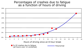 Um gráfico que descreve a relação entre o número de horas dirigidas e a porcentagem de acidentes de caminhões comerciais relacionados à fadiga do motorista.[31]