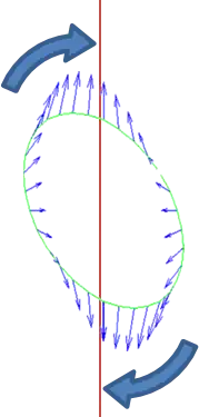 Se as protuberâncias de maré em um corpo (verde) estão desalinhadas com o eixo principal (vermelho), as forças de maré (azul) exercem um torque resultante sobre esse corpo que torce o corpo na direção do realinhamento