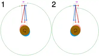 Em (1), um satélite orbita na mesma direção (mas mais lenta que) da rotação de seu corpo hospedeiro. A protuberância de maré mais próxima (vermelho) atrai o satélite mais do que a protuberância mais distante (azul), diminuindo a rotação do hospedeiro enquanto transmite uma força positiva líquida (setas pontilhadas mostrando forças resolvidas em seus componentes) na direção da órbita, elevando-o para uma órbita mais alta (aceleração de maré). Em (2) com a rotação invertida, a força resultante se opõe à direção da órbita do satélite, baixando-a (desaceleração de maré)
