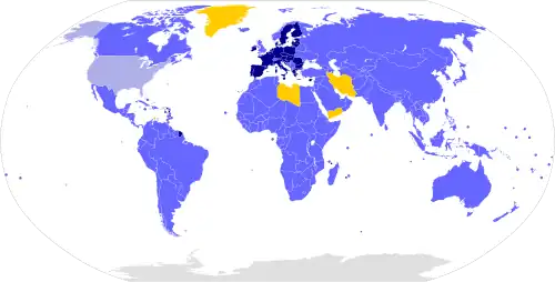 A UE e 193 estados, totalizando mais de 98% das emissões antrópicas, ratificaram ou aderiram a este tratado.[35][36][37] Os únicos países que não o ratificaram estão no Oriente Médio: o Irã é o maior poluidor deste grupo.[38] Eritreia, Líbia e Iêmen fizeram o mesmo.[35]