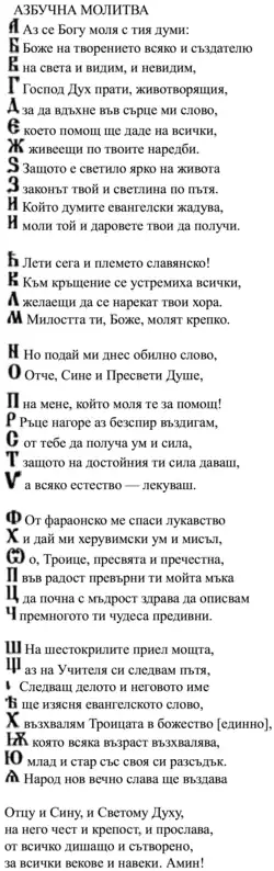 O búlgaro Constantino de Preslav escreveu um dos mais famosos abecedarius: a "Oração alfabética" (Азбучна молитва), um poema cristão escrito em versos dodecassílabos que se iniciam, cada um, com uma das letras do alfabeto glagolítico. A obra foi inspirada em uma similar, de autoria de Gregório de Nazianzo, que utilizava o alfabeto grego.[5]
