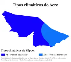 O clima é quente e muito úmido, do tipo Am de Köppen, e as temperaturas médias mensais variam entre 24 °C e 27 °C, sendo a menor média da Região Norte. As chuvas atingem o total anual de 2 100 mm, com uma nítida estação seca nos meses de junho, julho e agosto. A Floresta Amazônica recobre todo o território estadual. Muito rica em seringueiras da espécie mais valiosa (Hevea brasiliensis) e Castanheiras (Bertholletia excelsa), a floresta garante ao Acre o lugar de maior produtor nacional de borracha e castanha.