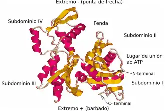 Está formada por dois domínios conhecidos como grande e pequeno, separados por uma fenda que leva no seu centro o lugar para a união do ATP-ADP+Pi. Por debaixo deste existe uma greta de menor profundidade chamada "sulco". Quando estão na sua forma nativa, apesar dos seus nomes, ambos os domínios têm um tamanho similar.,[15]