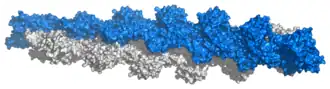 A descrição clássica da actina F indica que tem uma estrutura filamentosa interpretável como uma hélice levógira monocatenária com um giro de 166º e aumento de 27,5 Å ou bem como uma hélice dextrogira bicatenária com meio passo de rosca de 350-380 Å, e cada actina está rodeada doutras quatro.[20] A simetria do polímero de actina, que é de umas 2,17 subunidades por volta de hélice é incompatível com a formação de cristais, que só é possível quando estas são exatamente 2, 3, 4 ou 6 subunidades por volta. Portanto, devem ser realizados modelos interpretando dados procedentes de técnicas que superam estes inconvenientes, como a microscopia eletrónica, a criomicroscopia eletrónica, cristais de dímeros em distintas posições ou difração de raios X.[7] Na realidade, falar de uma "estrutura" não é correto para algo tão dinâmico como um filamento de actina, pelo que seria melhor falar de distintos estados estruturais, entre os quais o dado mais constante é o aumento de 27,5 Å, enquanto que a rotação das subunidades mostra uma considerável variabilidade, sendo normal observar deslocamentos de até 10% da sua posição ideal. Algumas proteínas, como a cofilina, parecem aumentar o ângulo de giro, mas, novamente, pode interpretar-se que, em lugar disso, estabilizam alguns "estados estruturais" normais. Estes poderiam ser importantes no processo de polimerização.[21]