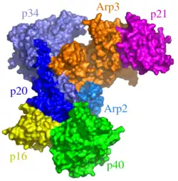 O complexo Arp2/3 está amplamente difundido em todos os organismos eucariotas.[58] É composto por sete subunidades, algumas das quais possuem uma topologia claramente relacionada com a sua função biológica: duas das suas subunidades, denominadas «ARP2» e «ARP3», possuem uma estrutura muito semelhante à dos próprios monómeros de actina. Esta homologia permite a ambas as unidades comportarem-se como agentes nucleantes da polimerização dos monómeros de actina G a actina F. Além disso, este complexo é necessário para estabelecer estruturas dendríticas e em anastomose (bifurcadas ou em rede), e, portanto, mais complexas, de actina F.[59]