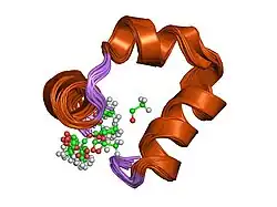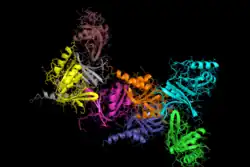 - A estrutura superssecundária mais notável é uma folha beta de cinco cadeias que se compõem de um meandro β e uma unidade β-α β dextrogira. Está presente em ambos os domínios. Isto sugere que a proteína surgiu por duplicação génica.[17]