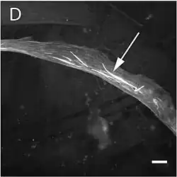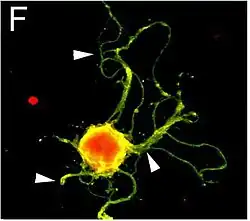 - Anéis de actina periódicos: Esta é uma estrutura especializada encontrada nos axónios. Trata-se de uma organização periódica constituída por anéis de actina uniformemente espaçados. Nesta estrutura, os anéis, juntamente com tetrâmeros de espectrina que ligam os anéis vizinhos, formam um citoesqueleto coeso que sustenta a membrana axonal.[71] A periodicidade desta estrutura (com intervalos de aproximadamente 190 nm) pode também regular a distribuição dos canais de sódio nos axónios.