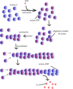 A polimerização e despolimerização da actina é necessária para a quimiotaxia e a citocinese. São necessários fatores nucleantes para estimular a polimerização da actina. Um desses fatores nucleantes é o complexo Arp2/3, que imita o dímero de actina G para estimular a nucleação (ou formação do primeiro trímero) de actina G monomérica. O complexo Arp2/3 une-se aos filamentos de actina com um ângulo de 70º para formar novos ramos de actina nos filamentos de actina existentes. Além disso, aos filamentos de actina une-se ATP, e a hidrólise deste ATP estimula a desestabilização do polímero.[39]